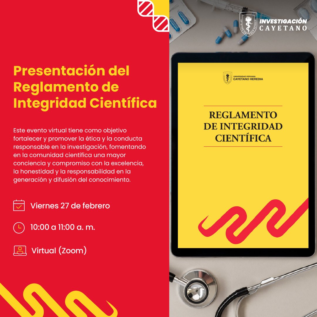 La Dirección Universitaria de Asuntos Regulatorios de la Investigación (DUARI) del Vicerrectorado de Investigación de Cayetano Heredia organiza un evento virtual fundamental para promover la ética en la investigación. La Presentación del Reglamento de Integridad Científica tiene como meta fortalecer el compromiso de la comunidad científica hacia la excelencia y responsabilidad en la generación de conocimiento. Este encuentro está destinado a estudiantes, docentes e investigadores, fomentando la conciencia sobre los estándares éticos esenciales en la práctica investigadora. La cita es el viernes 27 de febrero de 10:00 a 11:00 a.m. a través de Zoom. ¡No te pierdas la oportunidad de ser parte de esta importante iniciativa que busca elevar la calidad de la investigación en Perú!